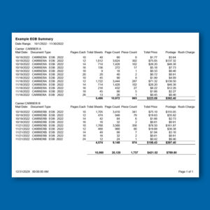 Billing reports provide details about anything CONSOLmx bills to the subscriber. Reports may include billed items with tracking numbers, color printout costs, mail drop costs, and other details.