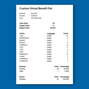 Reports about the Virtual Benefit Fairs feature data collected about what links within the Fair were clicked and can be filtered by date.
