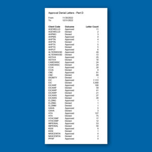 Clinical reports include statuses of clinical procedure status including approval/denial letters sent and prescriber data.